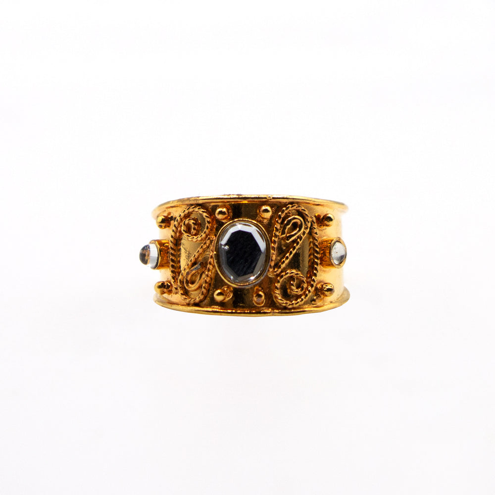 The gorgeous Kundan stone adorns the Kundan Silver Ring, breathtaking this jewellery. It is fashioned from sterling silver, and it features the Kundan stone. The stone represents elegance and sophistication due to the skilled craftsmanship that went into making it and its brilliant shine. This ring is an excellent example of how old craftsmanship and modern design can be harmoniously combined, drawing attention to its enduring beauty. The Kundan Silver Ring is an accessory that makes a statement, and it is ideal for individuals who value the aesthetic value of precise craftsmanship and the attraction of luxurious design.