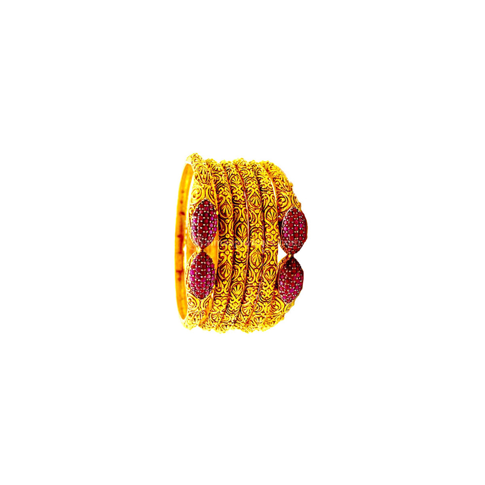 | Ruby Gold Flame Bangles combine heritage and modern design to create a stunning wristpiece. These bangles showcase timeless beauty with craftsmanship and love. Bangles with flame-inspired designs signify passion and fire. Ruby gemstones accent the design against the gold's warm, rich sheen. Each rich crimson ruby adds regal splendour and refinement to the composition. Simple and intricate, the bangles are ideal. Goldsmiths meticulously create every curve and shape to display their skill and passion. The rubies' flaming brilliance contrasts with the bangles' plain gold portions, enhancing their appeal. The Ruby Gold Flame Bangles exude elegance and originality, worn alone or with others. These bangles reflect gold and rubies' eternal beauty and are perfect for formal and informal situations. They adorn the wrists like flickering flames, providing a lasting sense of richness and beauty. |