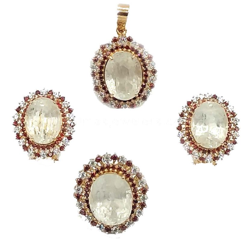 | Serenity Gold Locket Set combines the tranquillity of kunzite, the fiery attraction of ruby, and the brilliant brilliance of zircon stones in timeless gold. This luxurious locket set exudes grandeur and tranquillity with its vibrant symphony of colours and elegance. With meticulously set kunzite, ruby, and zircon stones, the Serenity Gold Locket Set creates a harmonious dance of colours on the golden canvas. The complex pattern captures and reflects light brilliantly, expressing tranquillity and elegance. Its adaptable beauty makes this combination a treasured and eye-catching addition for any occasion. Wear the Serenity Gold Locket Set to experience gemstones and gold's timeless beauty. This set may retain your essential memories and offer a touch of tranquillity and shine to your every gesture. The Serenity Gold Locket Set combines gold, kunzite, ruby, and zircon stones in a glamorous symphony. |