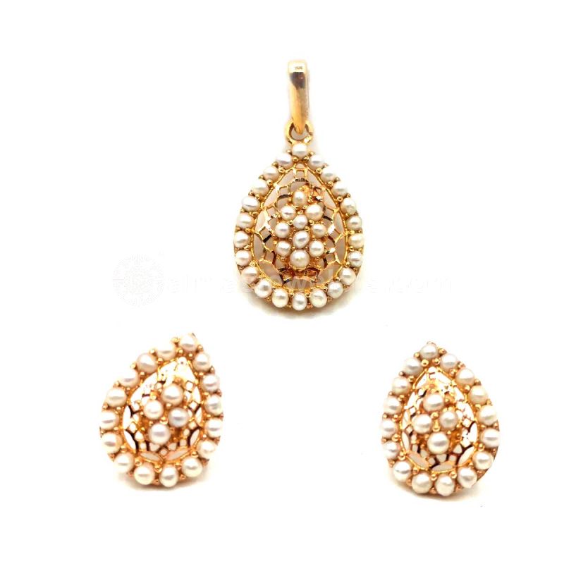 | The Pearl Gold Locket Set celebrates pearls' timeless elegance in dazzling gold. This magnificent locket set emanates luxury and timeless grace with sophistication and subtle beauty. The Pearl Gold Locket Set is meticulously crafted with pearls placed to create a superb and harmonious composition on gold. The complex pattern gently reflects light, producing a timeless elegance. Its adaptable beauty makes this combination a treasured and eye-catching addition for any occasion. Wearing the Pearl Gold Locket Set invites you to enjoy pearls and gold. Let this set store your memories, bringing timeless charm and brilliant elegance to your every move. Enjoy the Pearl Gold Locket Set's elegant blend of pearls and sophistication. |