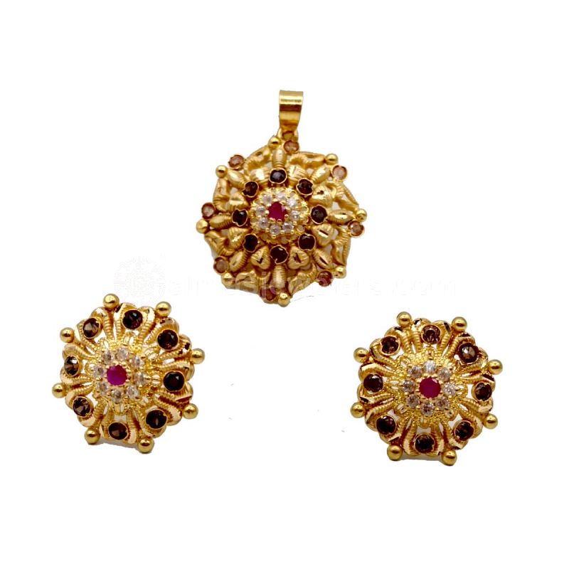 | The Garnet Gold Locket Set is a beautiful collection of garnet, zircon, and ruby stones in brilliant gold. This luxurious locket set exudes grandeur and timeless beauty with its rich colours and shine. With meticulously set garnet, zircon, and ruby stones, the Garnet Gold Locket Set dances colour and light on the golden canvas. The design sparkles with light, exuding glamour and grandeur. Its versatility and elegance make this combination a treasured and eye-catching addition for any occasion. The Garnet Gold Locket Set invites you to enjoy garnet, ruby, zircon, and gold's timeless beauty. This set may hold your memories and bring passion and beauty to your actions. Enjoy the Garnet Gold Locket Set, where elegance and beauty combine with gold and bright gemstones. |