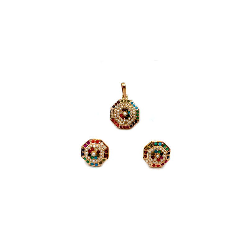 | The Naurattan Gold Locket Set showcases the brilliant colours of Naurattan stones in gold. This luxurious locket set exudes grandeur and everlasting beauty with its symphony of colours and elegance. The Naurattan Gold Locket Set's meticulously set stones on the golden canvas dance with colour and light. The design sparkles with light, exuding glamour and grandeur. Its versatility and elegance make this combination a treasured and eye-catching addition for any occasion. Wear the Naurattan Gold Locket Set to experience the beauty of Naurattan stones and the durability of gold. This set may retain your memories and lend a touch of colourful charm and radiant elegance to your every action. The Naurattan Gold Locket Set combines refinement with gold and stunning gemstones for a glamorous symphony. |