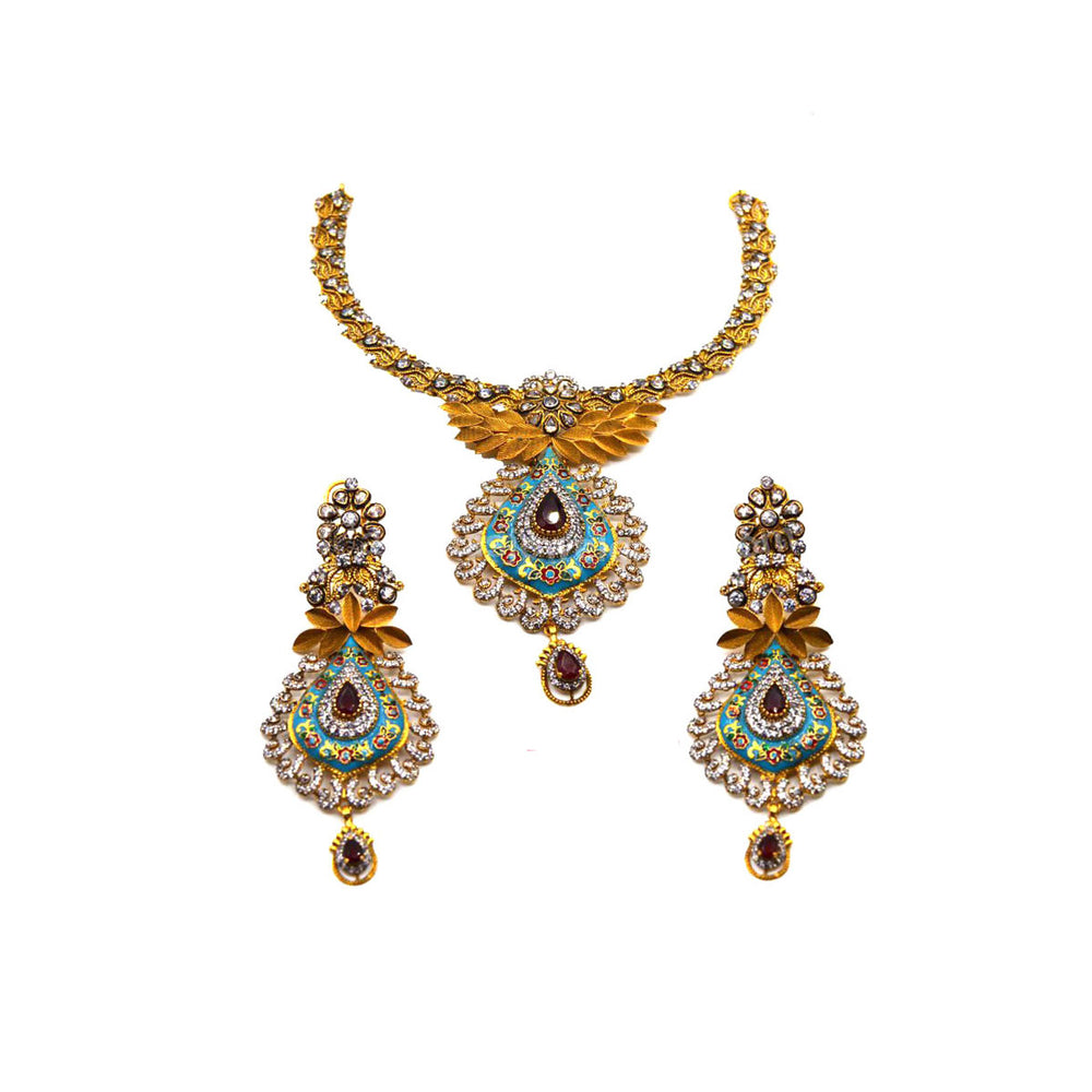 | The Golden Ember Ensemble Gold Set combines heritage and modernity. This stunning necklace set combines gold's elegance with zircon stones and meena enamel's vivid colours. The Golden Ember Ensemble's stunning necklace is studded with zircon stones, replicating embers' blazing light. The delicate meena enamel work adds colour and cultural charm to the ensemble. The necklace and earrings match, creating a sophisticated and vibrant ensemble. Golden Ember Ensemble Gold Sets are more than accessories—they celebrate heritage and modern elegance. A beautiful tapestry of gold, zircon stones, and meena enamel will grace your neckline, elevating your style for any occasion. |