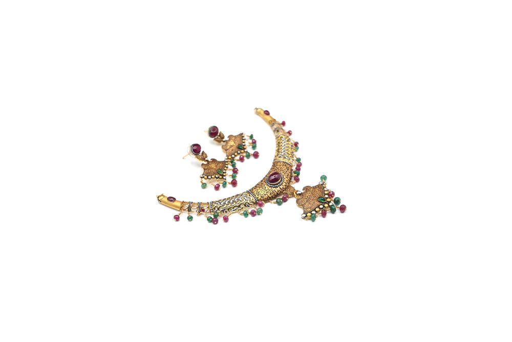 The Almas Enchantment jewelry set features a stunning blend of ruby zircons and pearls, set in gleaming gold, creating a harmonious fusion of bold color and timeless elegance, perfect for any special occasion.
