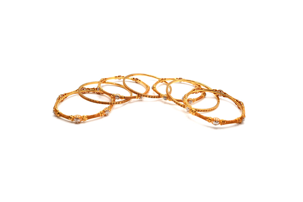 A timeless set of intricately textured gold bangles, radiating classic luxury and refined charm.