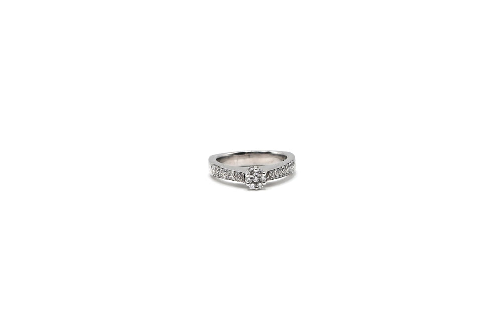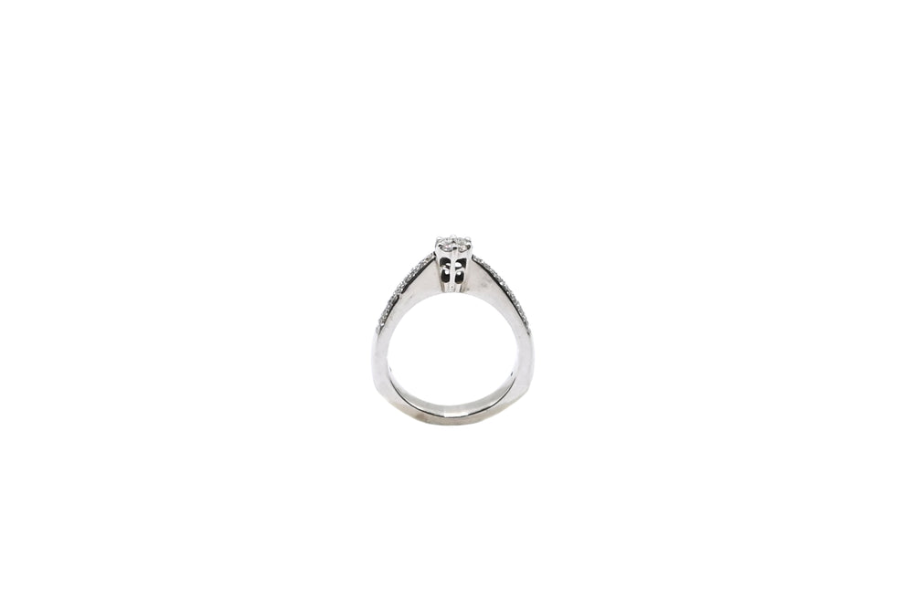 A radiant solitaire sparkles at the center, embraced by a diamond-studded band elegance that whispers timeless devotion.