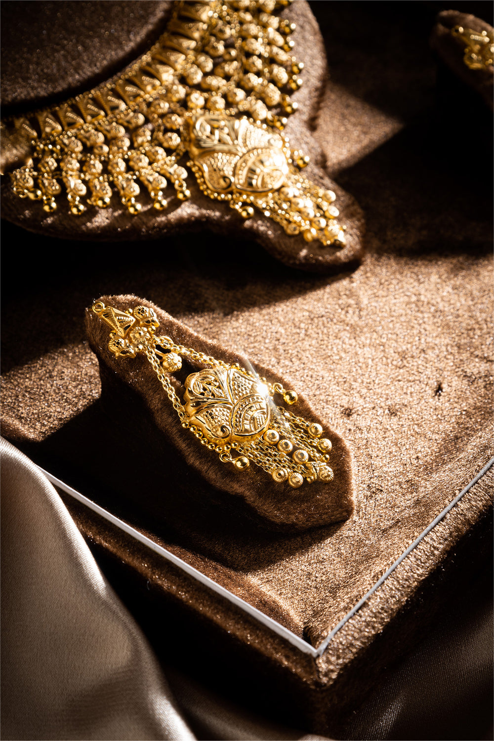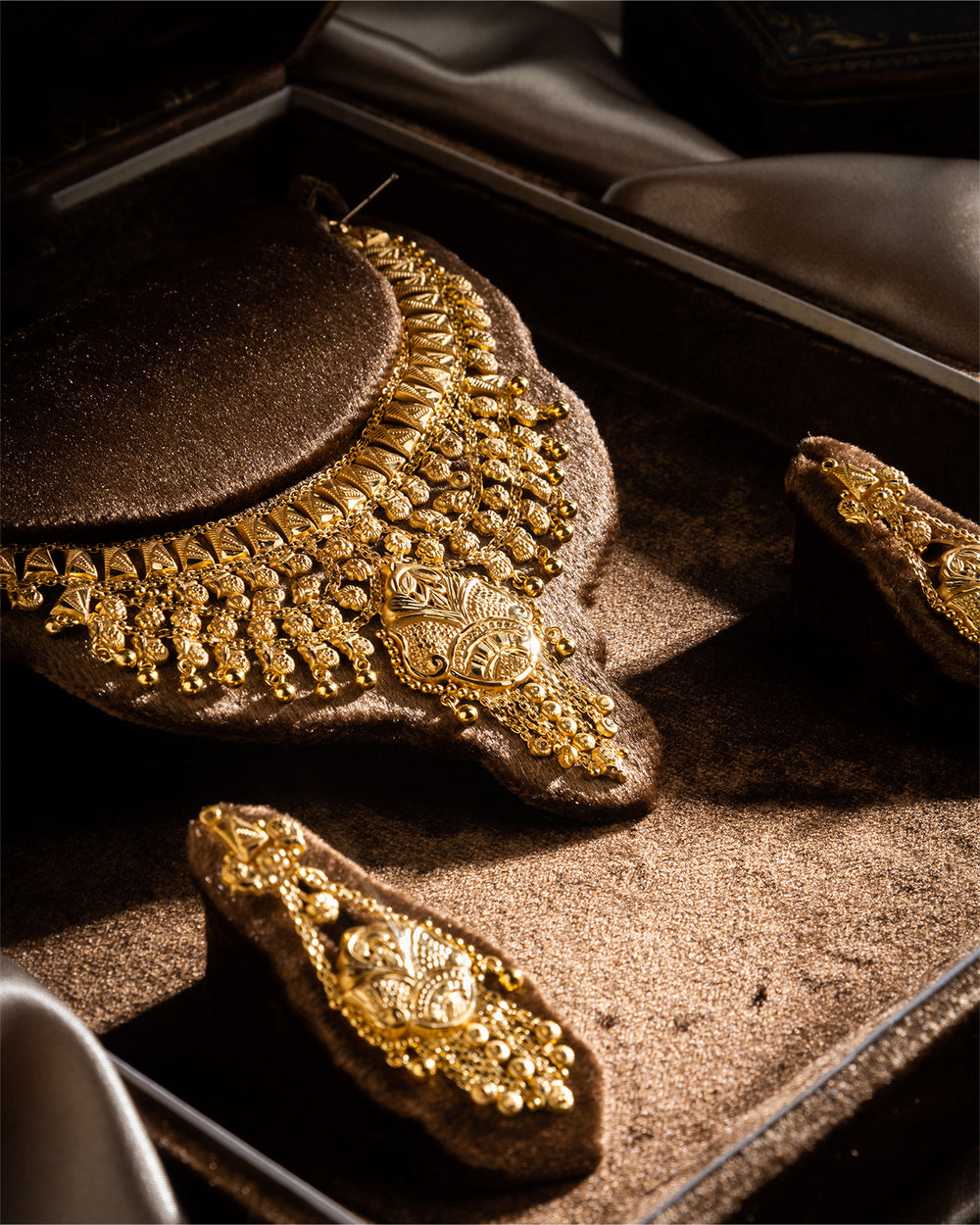The Classic Gold Set shows classic style and a high level of sophistication at its very best. The timeless allure of this precious metal is brought to light by this exquisite necklace set, crafted entirely out of gold. The necklace conveys a sense of refined elegance and understated luxury, which features links that have been artfully designed and intricate patterns. Each component of the Classic Gold Set exemplifies the everlasting allure of genuine gold while simultaneously encapsulating the essence of time-honoured sophistication. This set is more than just an accessory; it is a statement of timeless style ideal for individuals who value the understated elegance of wearing traditional gold jewellery. This versatile option can easily enhance any ensemble, leaving an indelible impression with unparalleled charm and elegance.