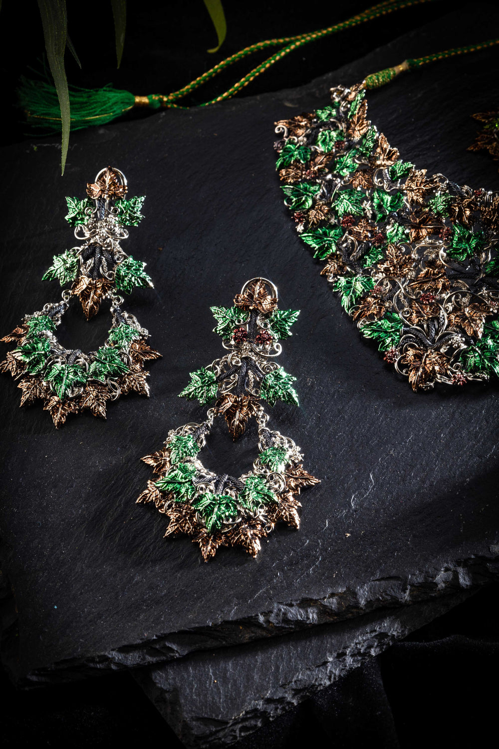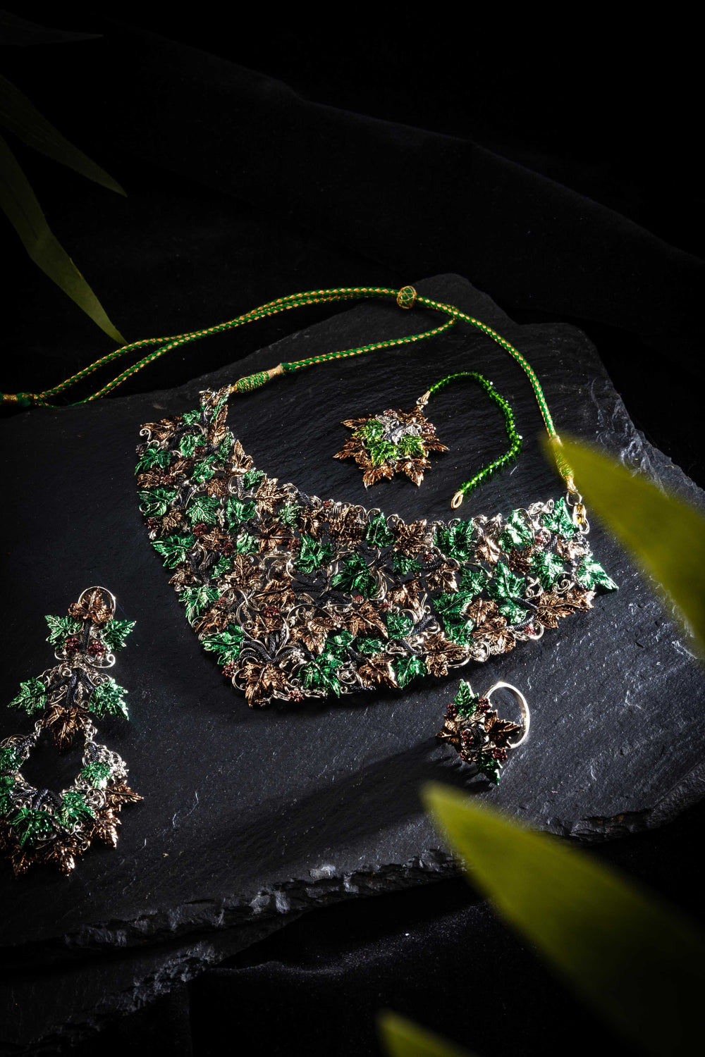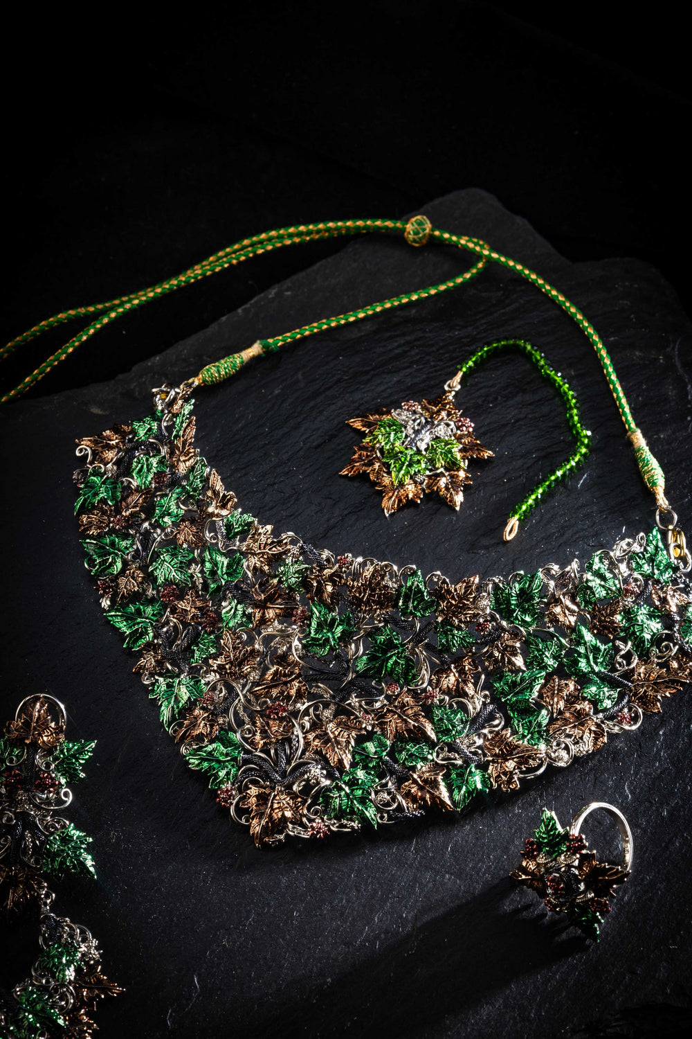 The Coral Majesty jewelry set features the vibrant hues of coral pearls, the elegance of champion moti, and the dazzling sparkle of zircon stones, creating a luxurious and captivating design that blends tradition with contemporary beauty.