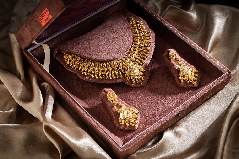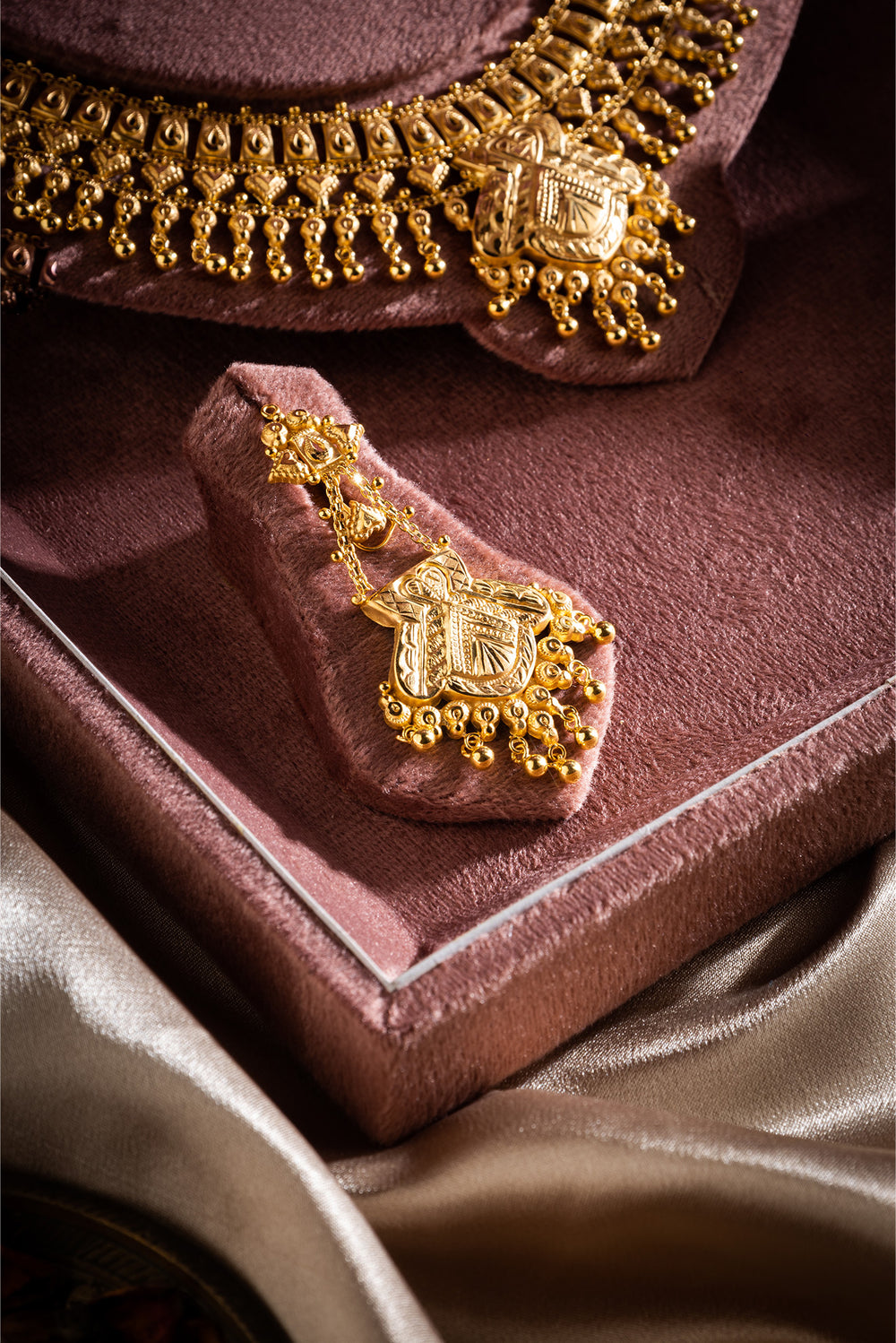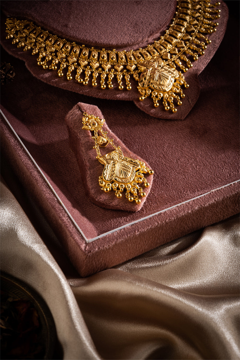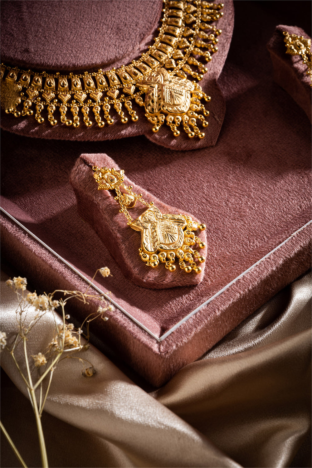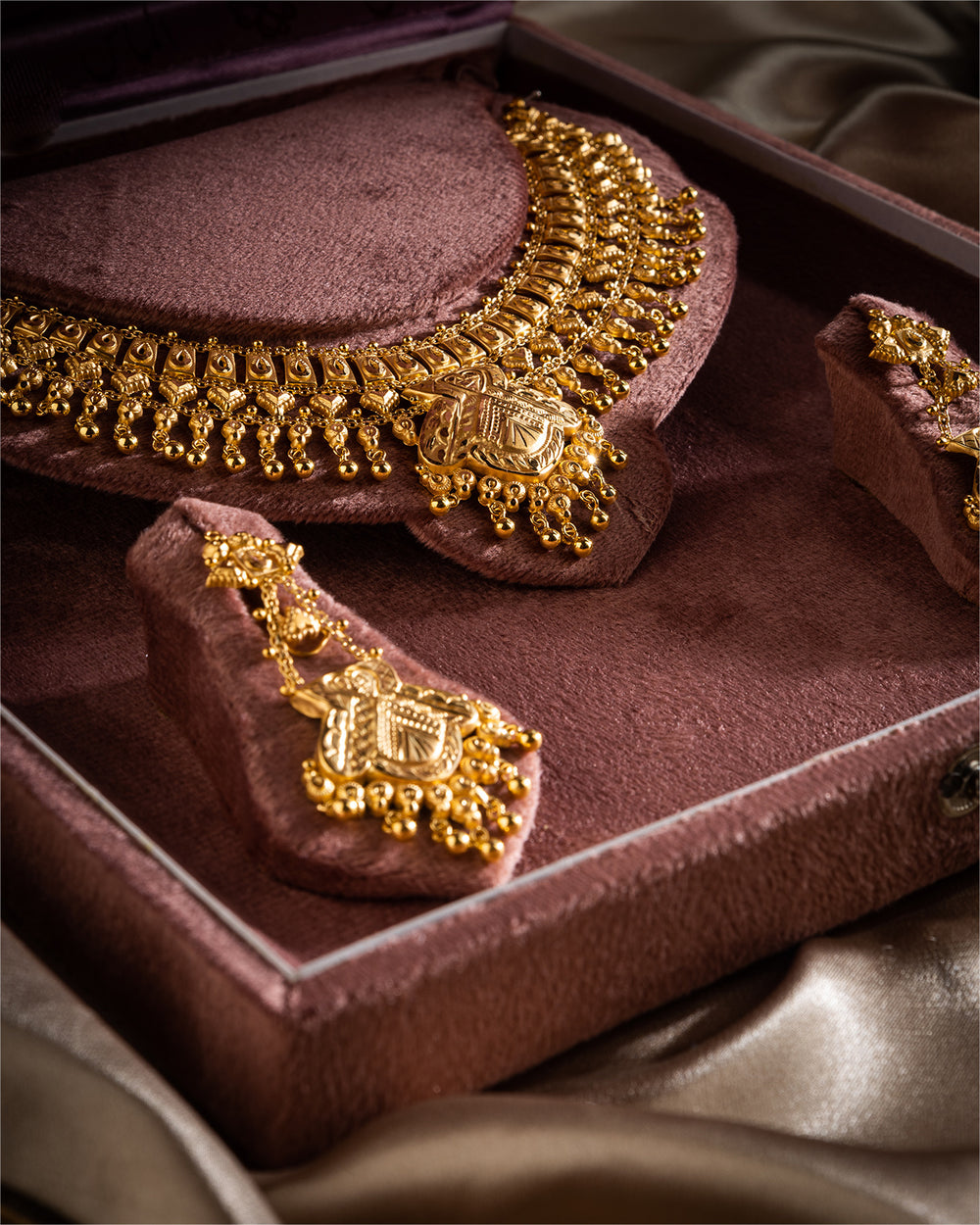The Divine Gold Set is a living testimony to the luxury and divine beauty. This set, made entirely from pure gold, exudes unparalleled luxury and sophistication. Its beauty is displayed in its purity and brilliance in this necklace, decorated with intricate designs and expert craftsmanship. The Divine Gold Set is a statement of regal beauty and sophistication, thanks to the allure that transcends time that it possesses. This exquisite ensemble is not just a piece of jewellery but a symbol of divine craftsmanship and unparalleled elegance. Because of this, it is the ideal option for individuals who value the splendour of pure gold in its most raw form.
