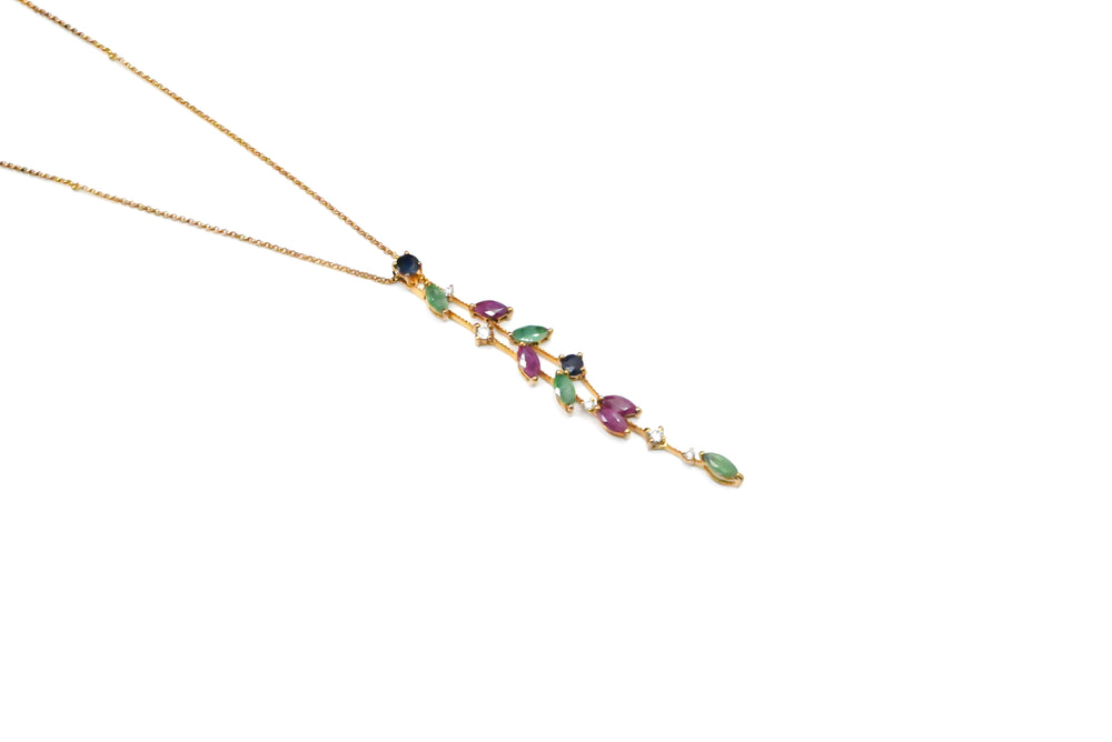 The Elysian Radiance jewelry set features a stunning combination of diamonds, rubies, and aquamarine stones, creating a perfect balance of elegance and vibrant color.