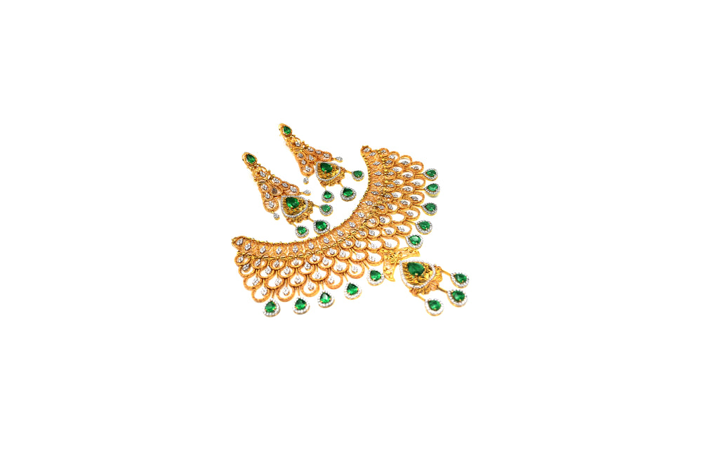 This breathtaking set features a majestic peacock-inspired necklace and matching earrings, adorned with brilliant emeralds and dazzling diamonds for unparalleled grandeur