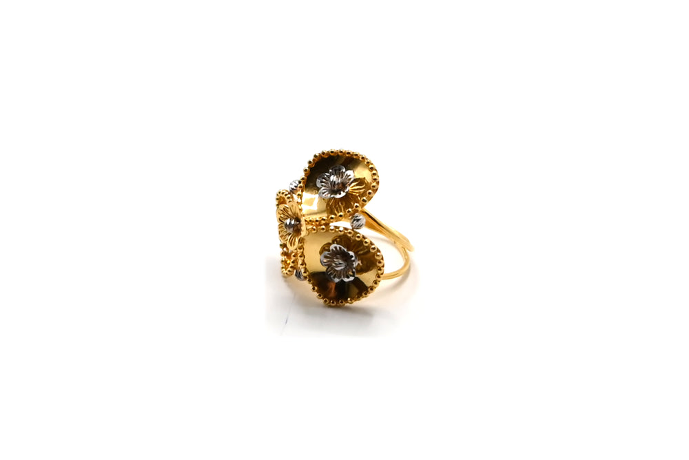 This ornate ring features a central cluster of three floral motifs, each adorned with diamonds, on a gold band.