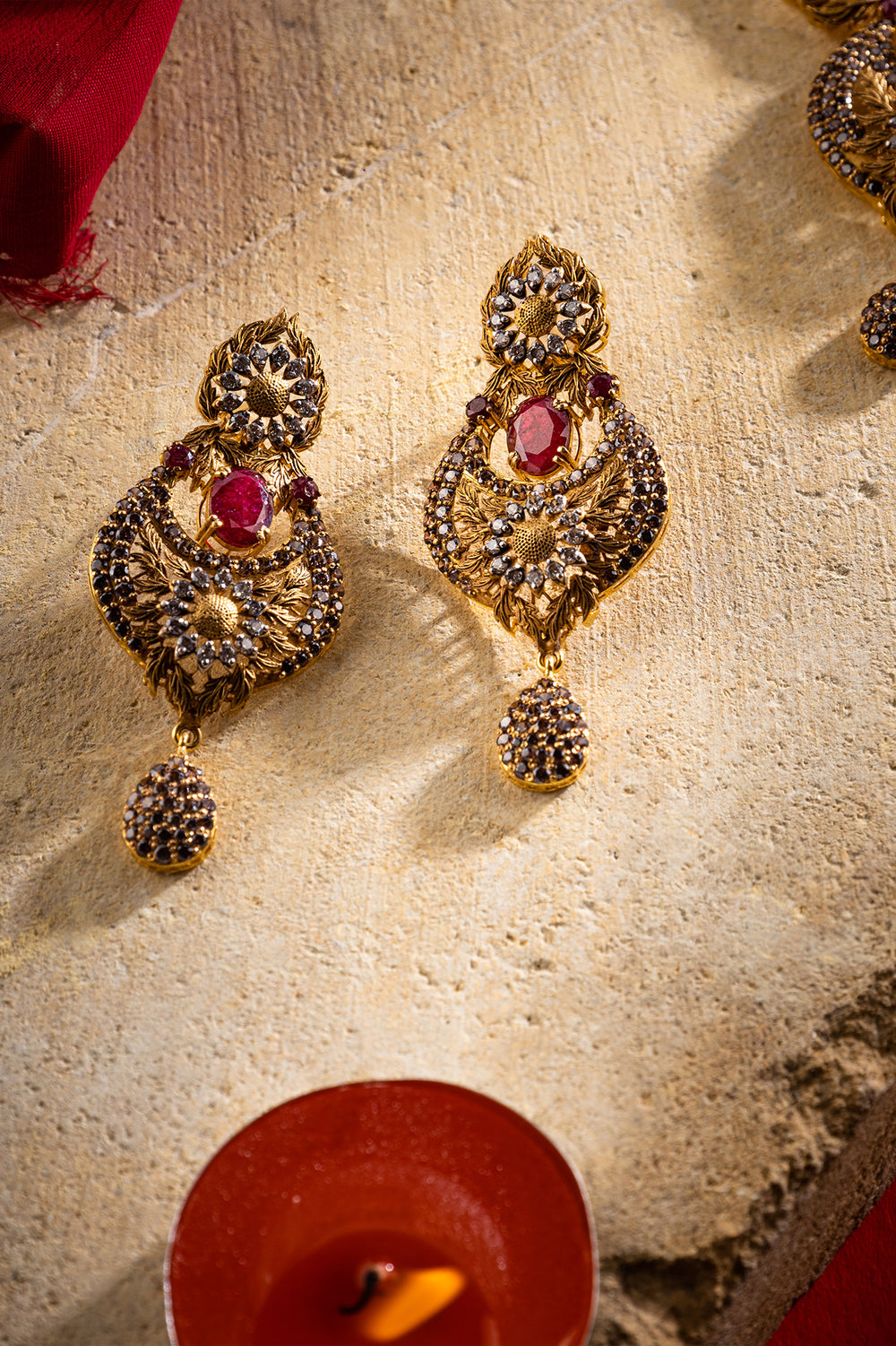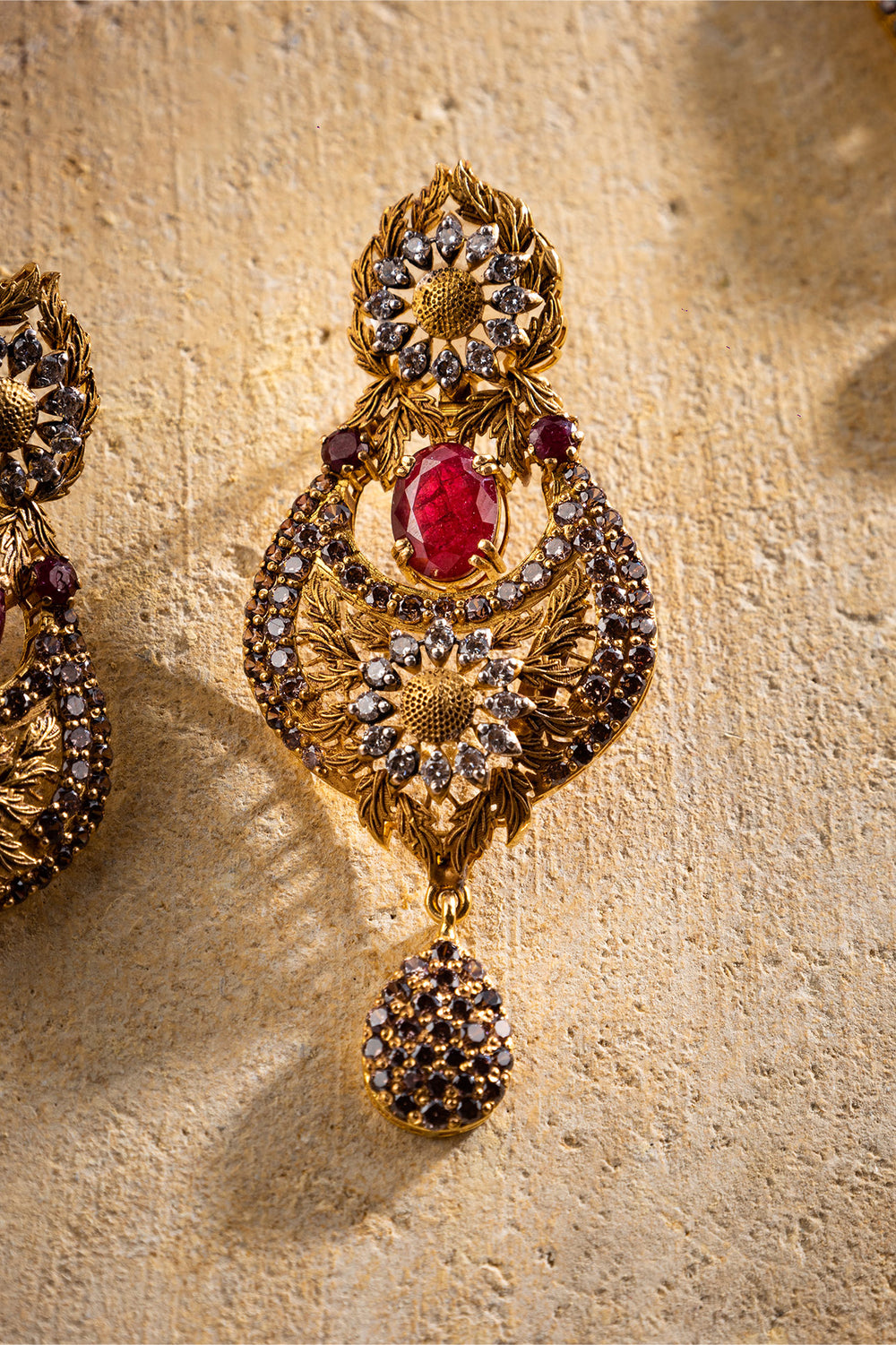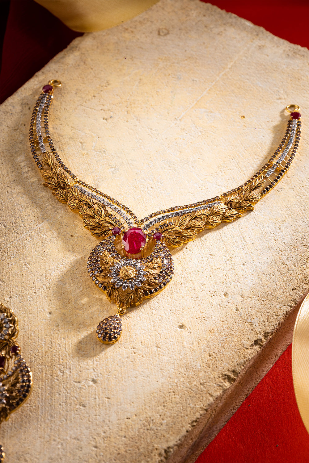 The Gem Trio Gold Set is a dazzling masterpiece that features a harmonious blend of radiant gemstones in luxurious gold settings. Each of the pieces in this set has its unique design. A deep garnet, which represents strength and determination, a brilliant ruby, which symbolises passion and vitality, and a sparkling zircon stone, which adds a touch of elegance to the set, are all included in the set. A luxurious and alluring ensemble is created as each stone is carefully created by hand and set in gold with great attention to detail. The Gem Trio Gold Set is a testament to sophistication and refined taste, making it the ideal accessory for those who value the enduring allure of precious gemstones set in a regal gold setting and who appreciate the sophistication and refined taste that this set exemplifies.