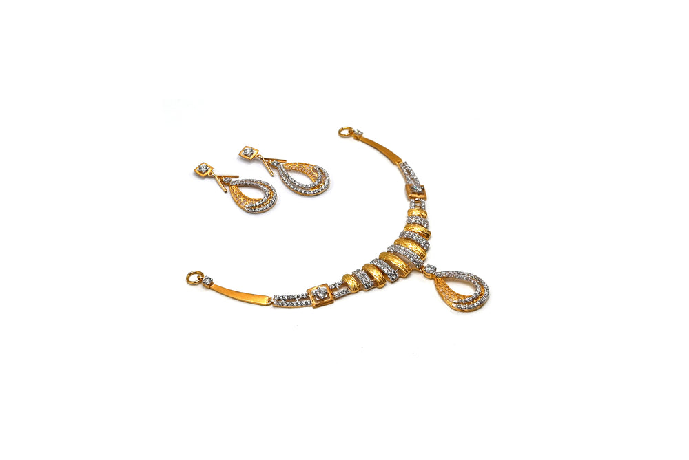 The Lustra Glow necklace is a radiant piece that combines the warmth of polished gold with the sparkling brilliance of white zircon stones. Each zircon is meticulously placed to capture and reflect light, creating a captivating shimmer from every angle. Designed for elegance and versatility, it pairs beautifully with formal and festive attire, making it perfect for weddings, evening events, or special celebrations. This necklace elevates any ensemble, adding sophistication and a touch of luxury to your look.