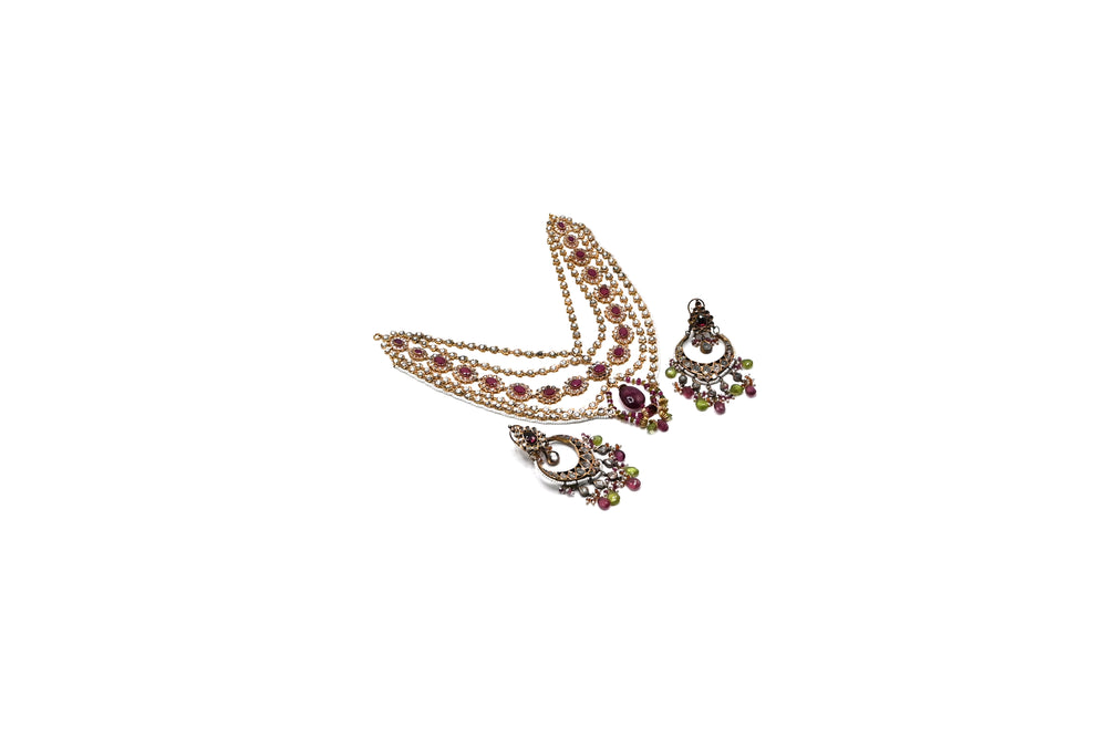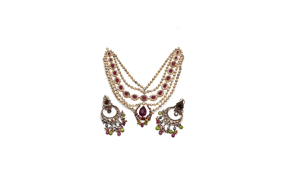 The Verdant Radiance necklace set is a vibrant fusion of Polki, Peridot, and Tourmaline stones, all set in lustrous gold. Each stone is carefully positioned to enhance its natural brilliance, creating a dazzling and harmonious display of color. The matching earrings complete the ensemble, making it perfect for weddings, festive occasions, or elegant evening gatherings. This set embodies luxury, sophistication, and a touch of contemporary flair while honoring timeless craftsmanship.