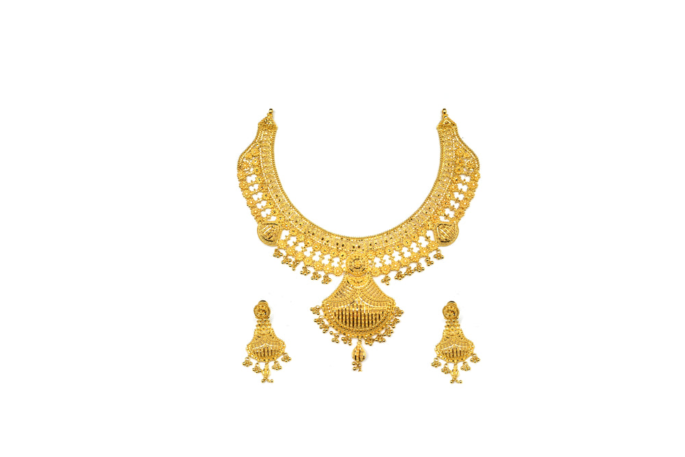 The Golden Radiance jewelry set exudes timeless beauty with its pure gold design, offering a perfect balance of elegance and sophistication for any occasion.