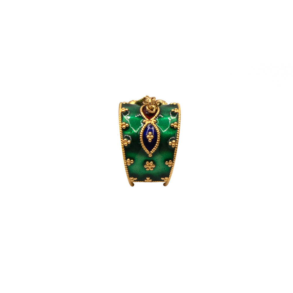 The Green Mina Gold Ring combines elegance with nature's splendour. This gold ring holds a stunning Green Mina stone with forest-green tones. The Green Mina enamel is a beloved enamel representing development, harmony, and energy due to its vivid green colour. The Green Mina Gold Ring evokes the tranquillity of lush greenery, fresh leaves, and blooming flowers. The delicate gold ring enhances the Green Mina enamel's natural brilliance and balances organic and elegant. Wearing the Green Mina Gold Ring celebrates life's vibrancy and nature's beauty. This ring elevates every outfit, whether worn to symbolise personal growth or nature's tranquillity. The timeless Green Mina Gold Ring represents harmony and vigour and appeals to nature and style enthusiasts.