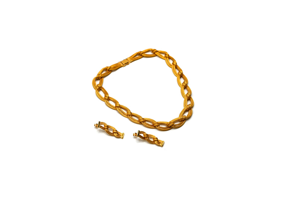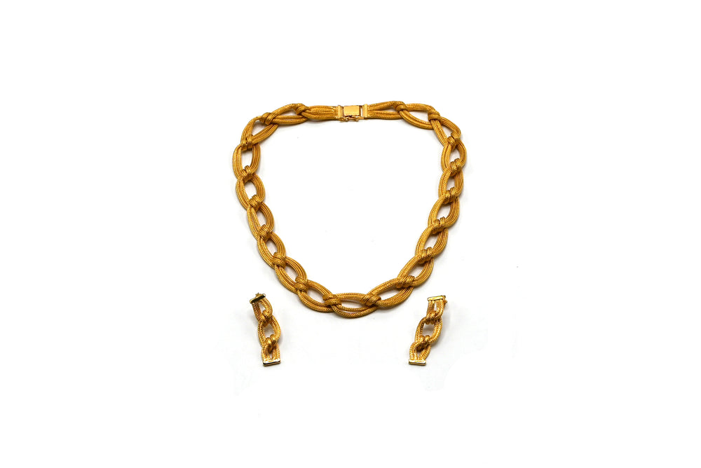 The Golden Harmony necklace set celebrates the elegance of pure gold in its simplest form. Crafted from high-quality polished gold, the set includes a beautifully contoured necklace and matching earrings, exuding timeless sophistication. Ideal for weddings, festive occasions, or formal events, this set adds a touch of luxury and classic charm to any outfit. Its minimalist yet refined design ensures a versatile and statement-making addition to any jewelry collection.