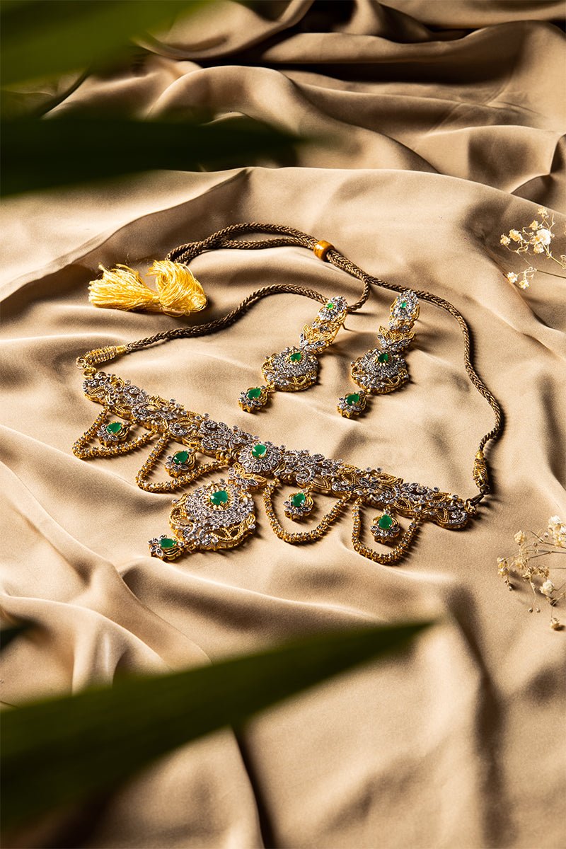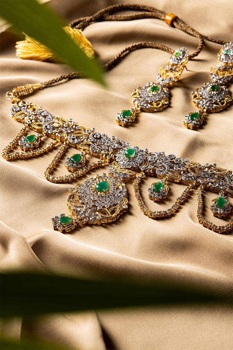 This set's sleek design is inspired by the natural elegance that will never go out of style. It's perfect for a traditional bride who values understated beauty, thanks to the rich green tones of the Jade stones and the brilliant Zircon. You're adding the last touch of sophistication to your bridal ensemble. Be memorable as you make your way down the aisle.