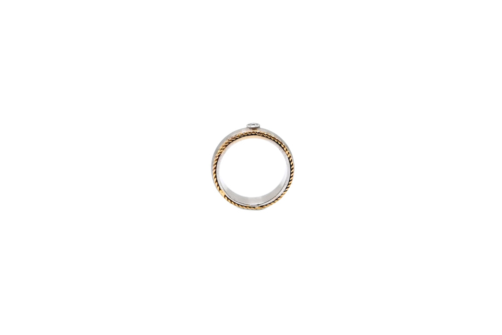 A sleek dual-tone ring with a central diamond and twisted rope detailing on the edges.
