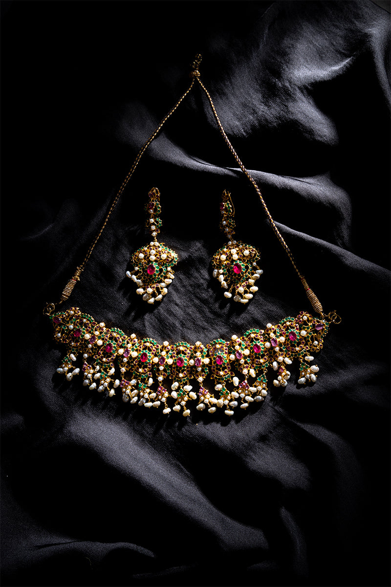 This set is fit for a queen, with its blend of the ever-classic Pearl and the regal charm of Ruby gems. This is the result for the bride who desires natural opulence and lasting memories: a show-stopping item of exquisite beauty—improving the sophistication of your once-in-a-lifetime celebration.