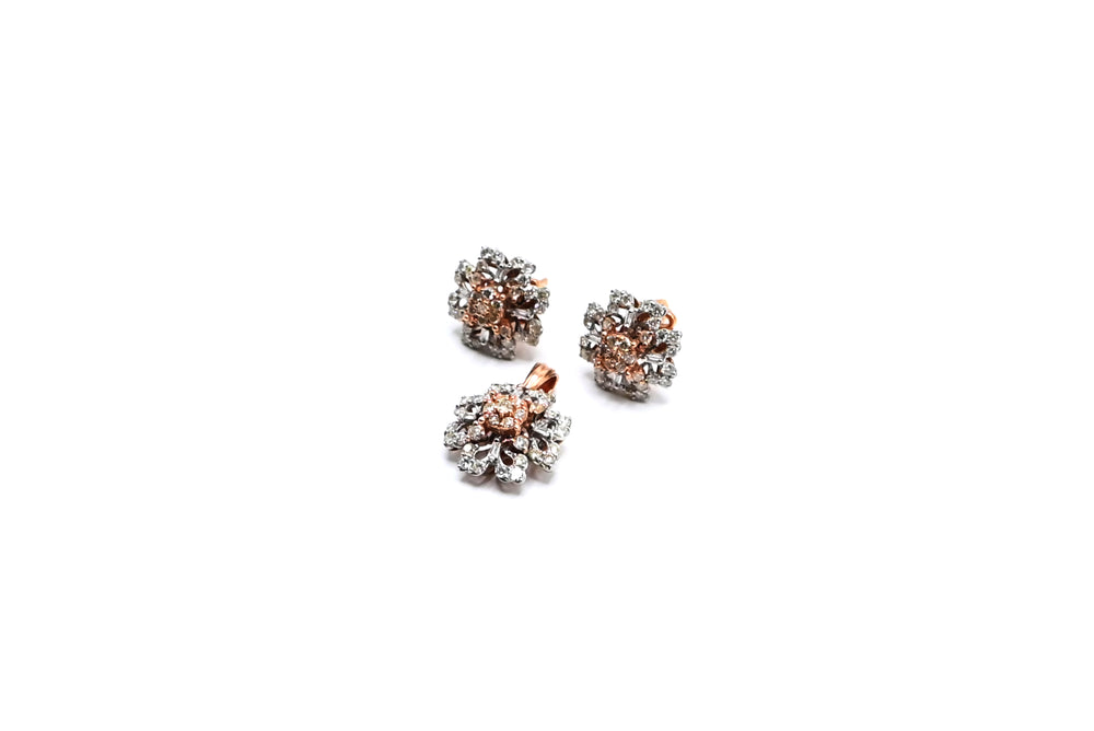 An 18K floral pendant radiating with layered diamond brilliance capturing light, elegance, and timeless beauty in every petal.