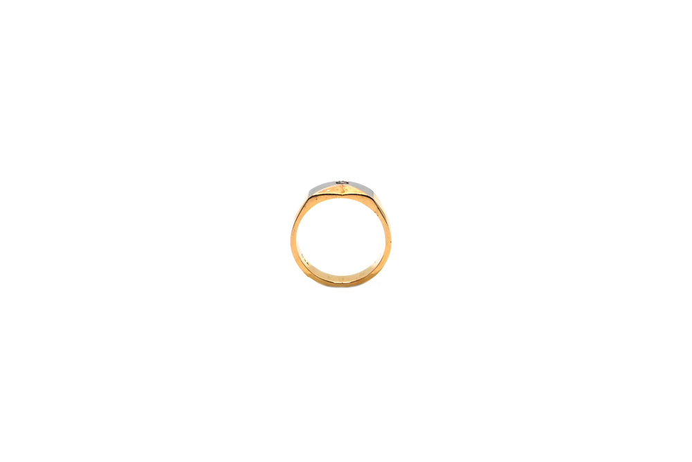 A bold, masculine band with a single gleaming diamond set in a sharp two-tone design embodying strength, clarity, and timeless elegance.