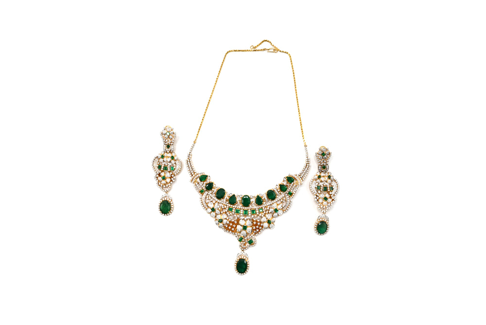 The Verdant Glow jewelry set features the rich green hues of emeralds paired with the striking brilliance of gromiti stones, all set in luxurious gold to create a perfect harmony of color and sophistication