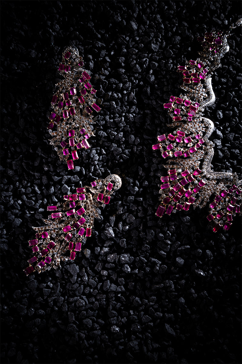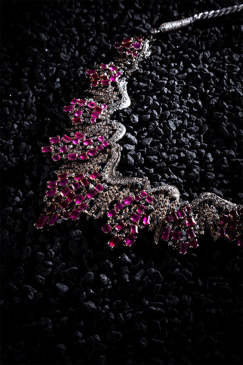 The combination of Victorian opulence and cutting-edge style. The Shampion, Zircon, and Ruby stones combine to create a compelling and royal air, elevating your bridal look with a touch of classic elegance, making it an excellent choice for a bride who wants a touch of glamour and cutting-edge style on her wedding day.
