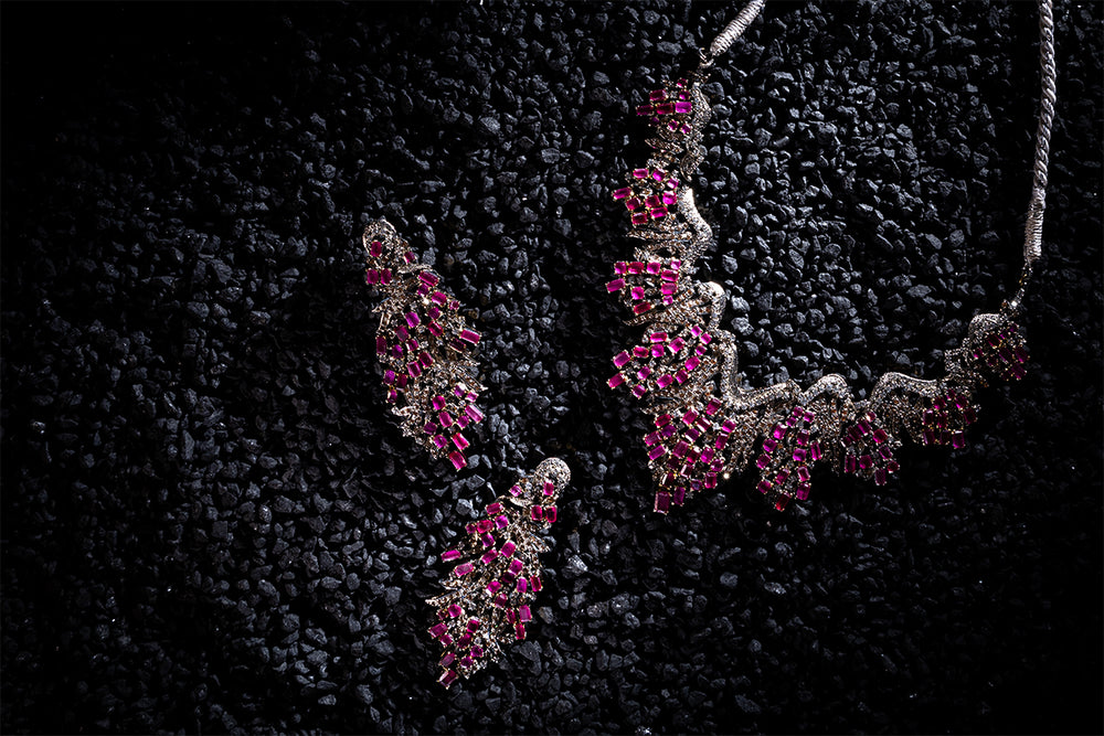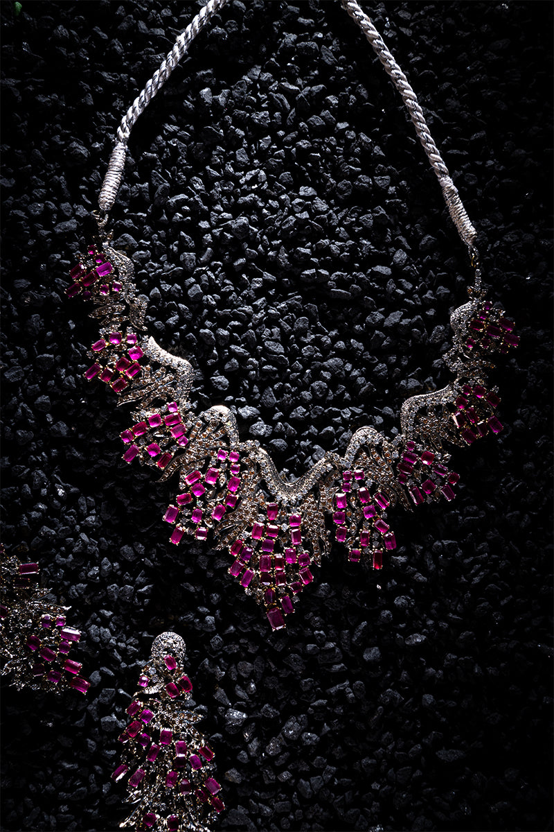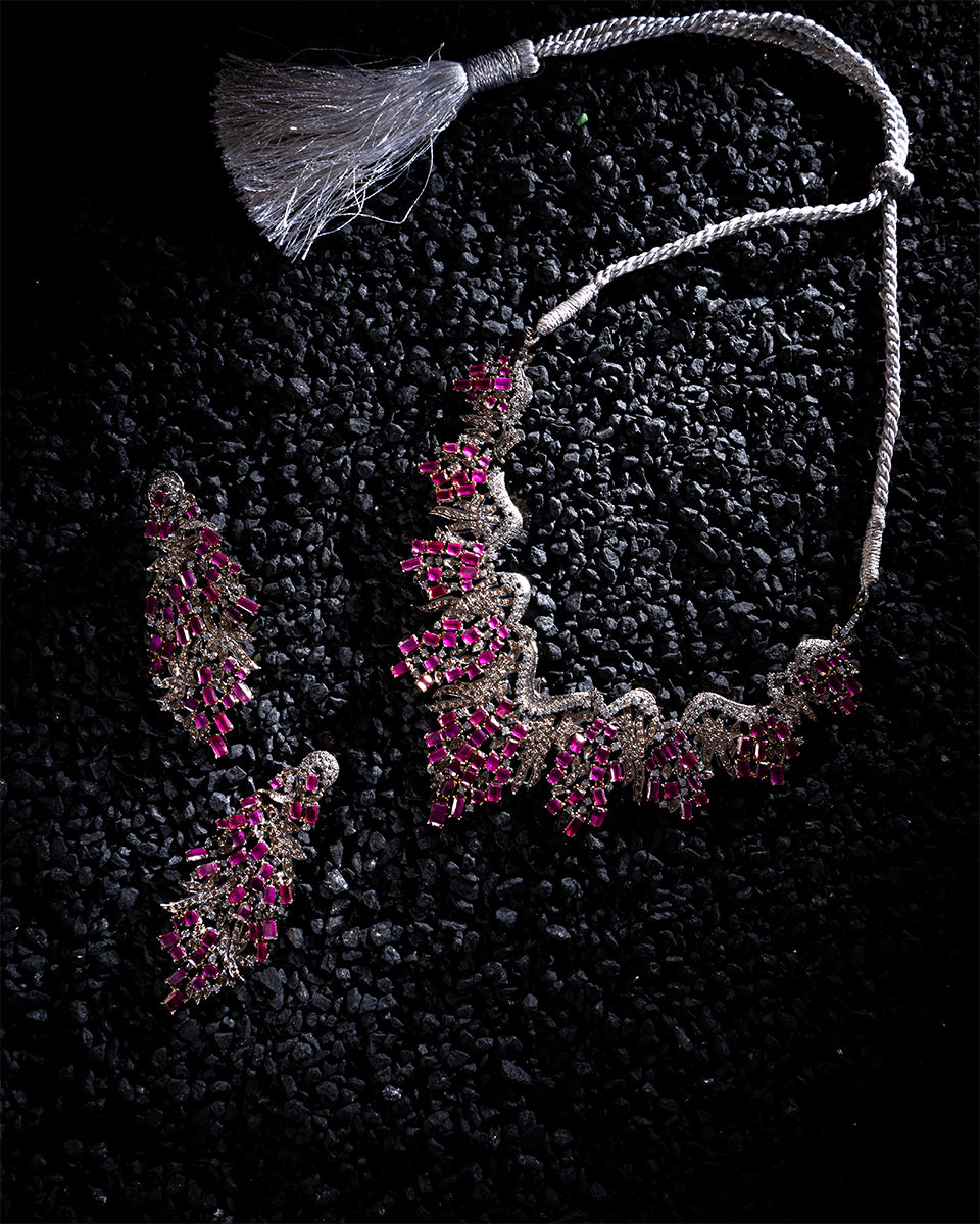 The Victorian Jubilant Gemfire Silver Set is a wedding masterpiece that celebrates the past while remaining classically beautiful. This magnificent combination, set in shimmering silver, combines the champagne-like shine of the Shampion with the glittering brilliance of the Zircon and the blazing red of the Ruby.