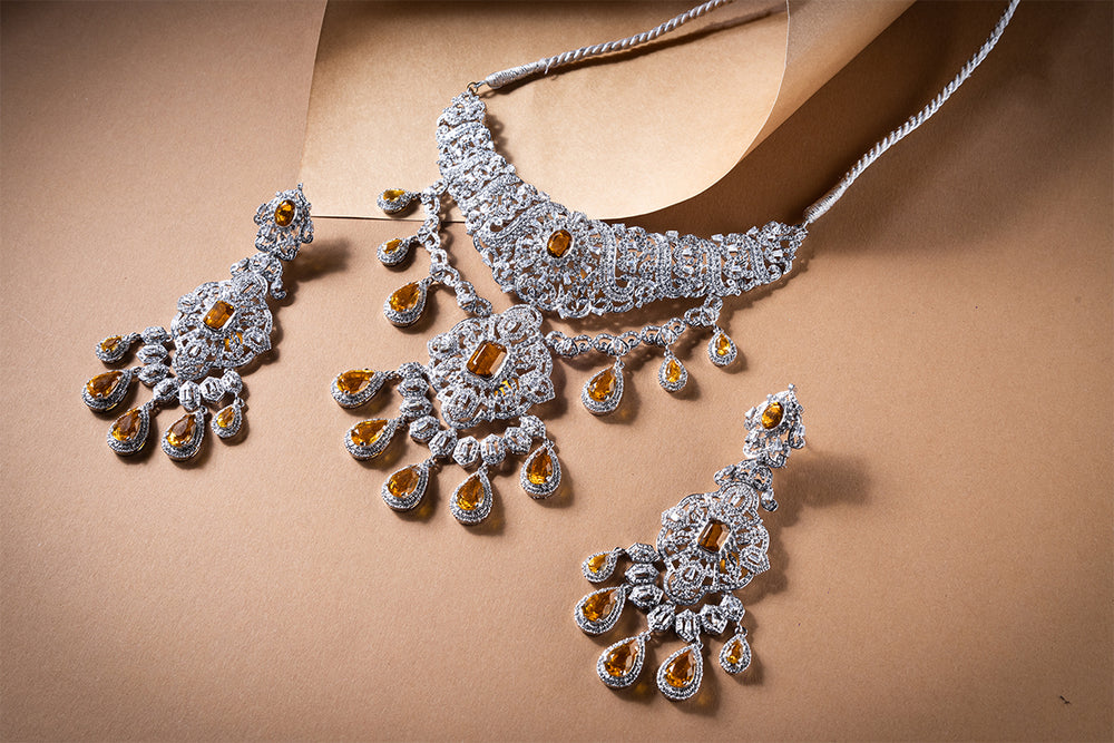 The Victorian Radiance Silver Set is reminiscent of a bygone era because of its elaborate design and classic aesthetic. Shampion stones give a champagne-like golden glow, and zircon stones shine brightly. They're the perfect pair, ensuring that you'll be the focus of everyone's attention at the ceremony. The Victorian Radiance Silver Set will be the focal point of your bridal ensemble as you enter a life of love and refinement.