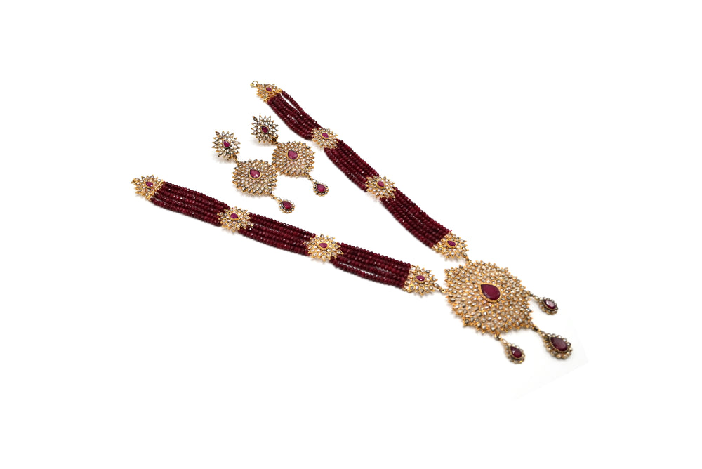 The "Zaraya" set showcases vibrant rubies and zircon stones in a sleek design, including a necklace and earrings perfect for special occasions.